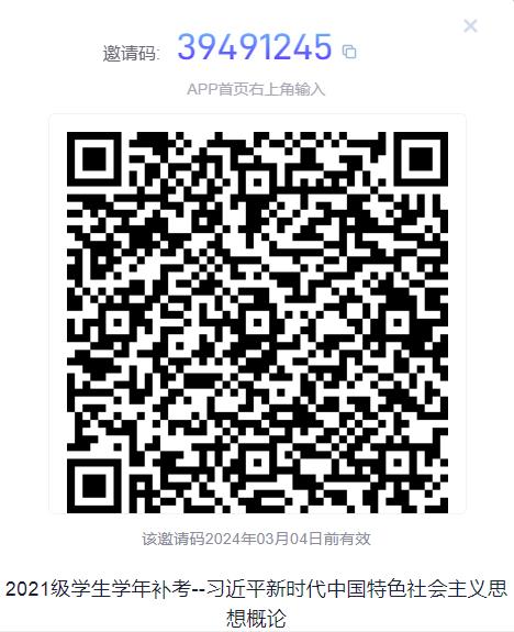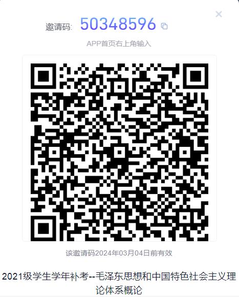 该课程定于9月12日(周二)晚上19:00-20:00进行超星线上统一闭卷考试,负责教师为思政部司亚琦老师。考试总分为50分,最终补考成绩按照超星考试成绩的2倍进行核算,超星补考班级码如下图: