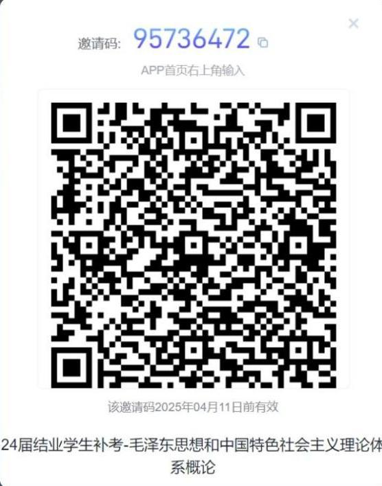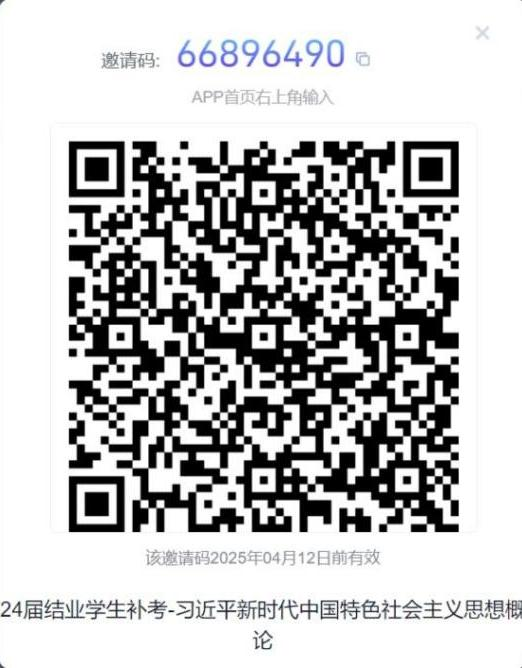 3、习近平新时代中国特色社会主义概论课程补考安排:该课程补考时间定于 10 月 19 日(周六)下午 14:00-15:00 进⾏超星线上统⼀闭卷考试,考生需在每场考试前⾄少两⼩时加⼊考试群,负责教师为刘兆熙老师(13674926390)。考试总分为 50 分,最终补考成绩按照超星考试成绩的 2倍进行核算,超星补考班级码如下图: