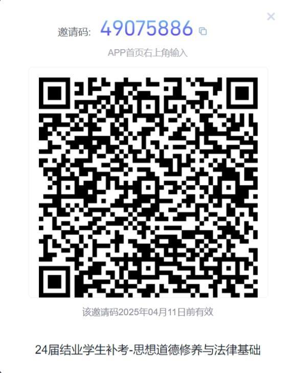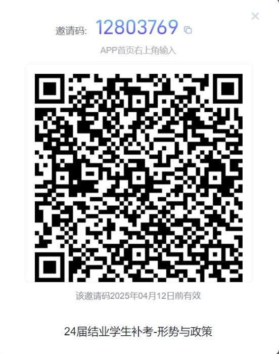4、《形势与政策》课程补考安排:该课程补考时间定于 10 月 19 日(周六)下午 15:30-16:30 进行超星线上统⼀闭卷考试,考生需在每场考试前⾄少两⼩时加⼊考试群,负责教师为张洁老师(15111888701)。考试总分为 50 分。最终补考成绩按照超星考试成绩的 2 倍进行核算,超星补考班级码如下图: