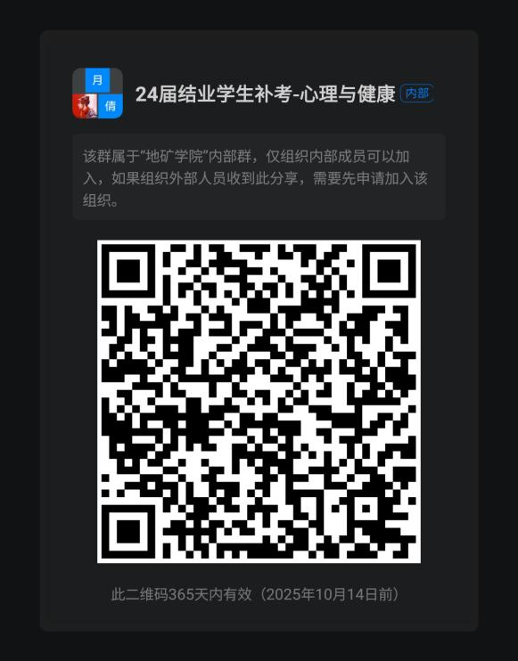 6、《心理健康》课程补考安排:该课程定于 10 月 15 日--19 日进行自主补考,请需要补考本⻔课程的同学咨询翟倩老师(13837182536),加⼊下图钉钉群,按照要求完成补考。