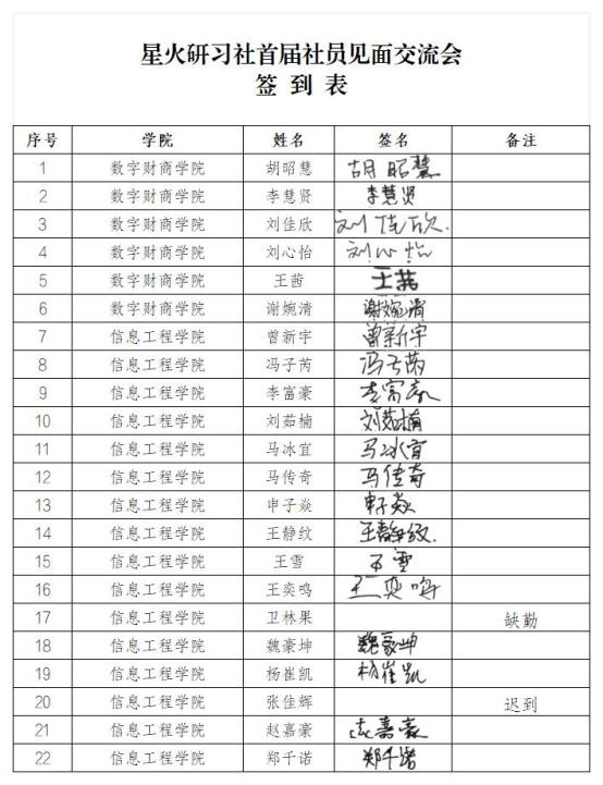 星火研习社首届社员见面交流会签到表